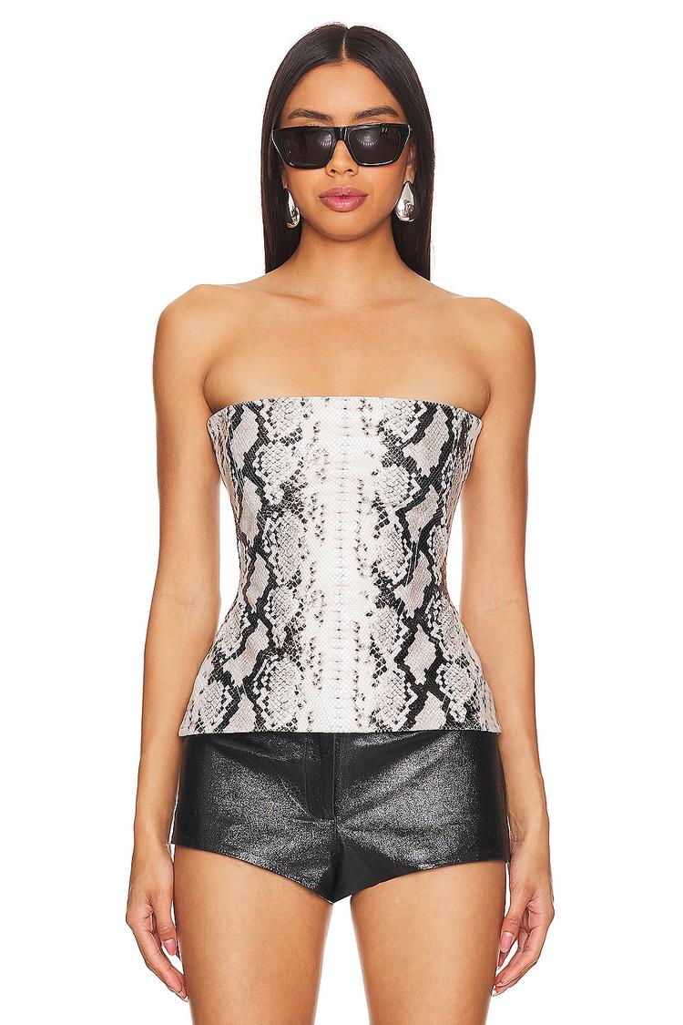 Patent snake-embossed leather shapes a sleek corset top with a fitted silhouette and strapless straight neckline that highlights your shoulders. The midweight fabric and exposed back zipper combine edgy style with wearability. Perfect for night outs, date nights, or girls' nights, this chic and trendy waist-length top pairs effortlessly with leather shorts or sleek trousers for a bold statement look.