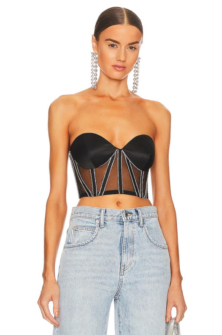 Sleek matte black nylon corset with structured boned bodice and mesh paneling offers a fitted silhouette that accentuates curves. The sweetheart neckline and strapless sleeveless design enhance an edgy, sexy vibe, adorned with silver-tone crystal embellishments that add subtle sparkle. Featuring a back zipper closure, this cropped top is perfect for spring and summer nights out, date nights, or girls’ night events. Crafted with lightweight polyester lining, it combines comfort and style for an unmistakably modern look.