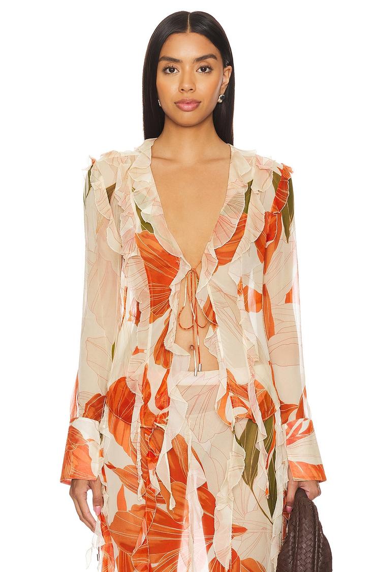 Soft chiffon silk and delicate ruffle trims define this hip-length blouson top with a deep neckline and long cuffed sleeves featuring tie details. Its relaxed fit and romantic floral print in cream, orange, and olive create an elegant yet effortless silhouette. Ideal for brunches, date nights, and cocktail events, this lightweight and chic top brings a sophisticated flair to your seasonal wardrobe.