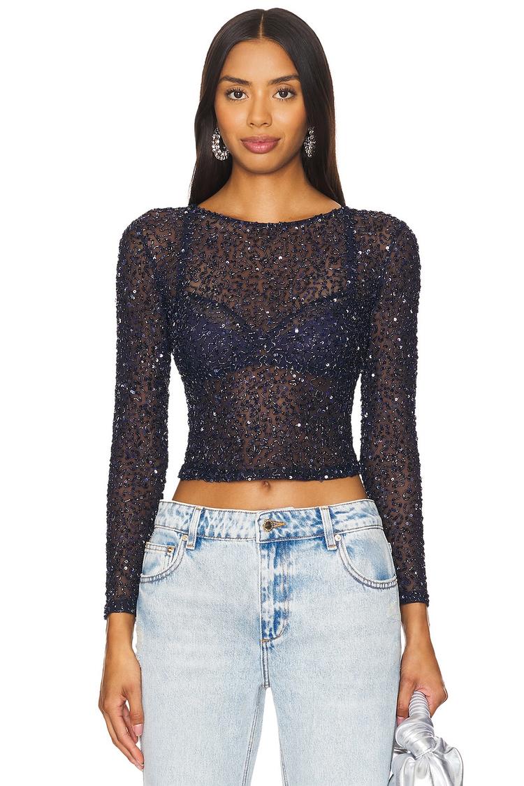 Shimmering navy sequins adorn this fitted cropped top crafted from sheer mesh nylon, creating an effortlessly sexy and chic look. Featuring a classic round neck and long regular sleeves, it showcases an exposed back zipper for a sleek finish. The all-over sequin embellishments add glamorous sparkle, perfect for night outs, cocktail parties, and girls' nights. Its cropped length and elegant silhouette make it a versatile statement piece that combines edgy sophistication with timeless appeal.