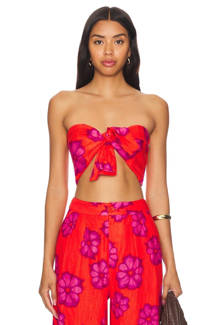 Bright red linen and cotton blend fabric brings vibrant energy to this bandeau top, featuring a cropped length and fitted silhouette that flatters the figure. The strapless neckline and sleeveless styling enhance its breezy summer appeal, while smocked detailing on the back adds texture and comfort. A charming front tie-up bow serves as a standout design detail, perfect for casual beach days, vacation escapes, or lively brunches. This Toni Top offers a trendy yet effortless vibe for warm-weather wardrobes seeking bold floral prints and a playful, chic look.