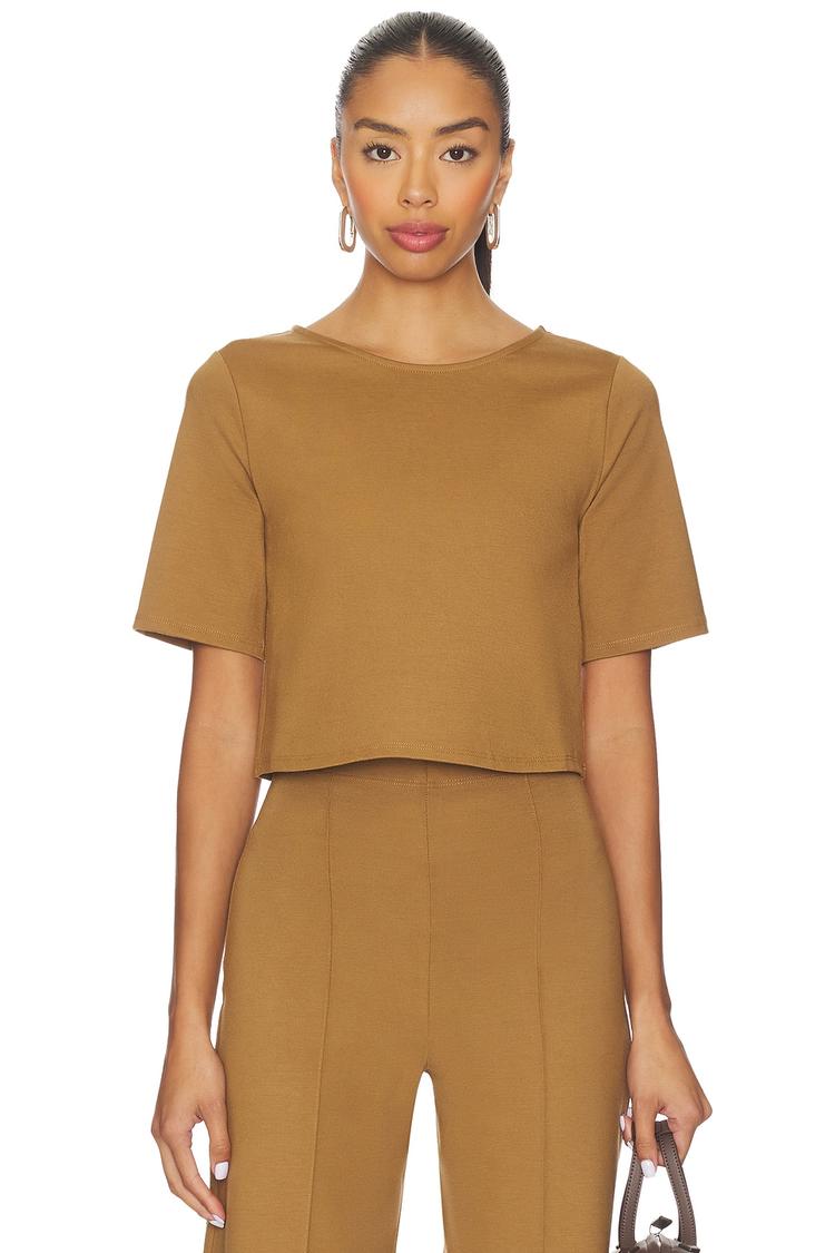 A sleek cropped top in a matte tan hue crafted from a viscose-nylon blend for a smooth, comfortable fit. Featuring a minimalist round neckline and extended half sleeves, this modern silhouette offers a regular fit that pairs effortlessly with tailored bottoms. Its pullover style and clean lines make it an ideal choice for casual days, workwear, and business casual settings, blending classic simplicity with contemporary ease across seasons.