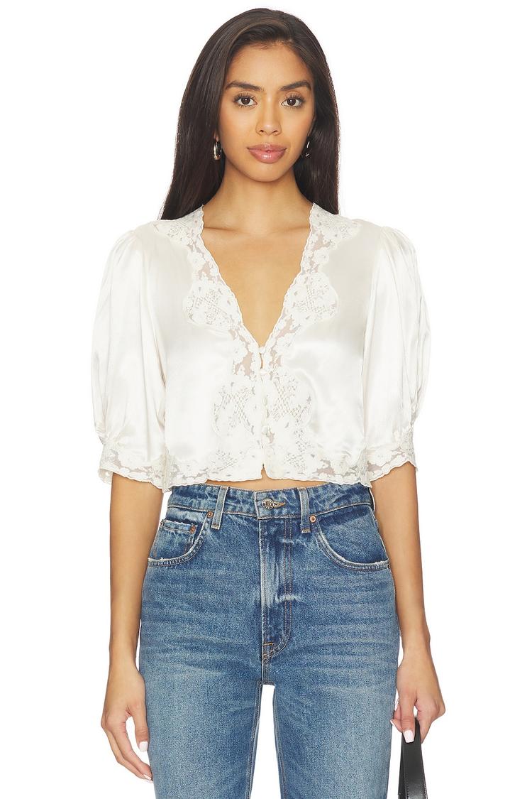 Soft viscose fabric and delicate lace trim frame the romantic V-neckline and front button-down closure of this cropped blouson top. Elbow-length blouson sleeves with elastic cuffs add airy volume, while the relaxed fit and scalloped lace detailing at hem, collar, and cuffs create an elegant, timeless look. Ideal for spring and summer, this versatile piece transitions effortlessly from casual brunches to intimate date nights, offering both comfort and refined style.