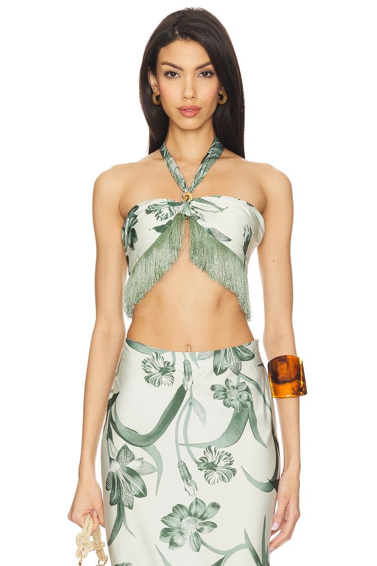 Feel the sunlit breeze with this Rococo Sand Fringe Top. A halter-neck silhouette ties at the neck and back, framing the collarbone while front-bead accents add subtle sparkle. Crafted in a midweight satin blend (polyester with elastane) with a viscose lining, it drapes softly over the torso and is sculpted by boned sides for a fitted feel. The fringe trim sways with every movement, delivering boho-chic drama. The botanical-green print on ivory makes it vacation-ready with versatility—pair with the matching skirt, denim, or a flowy skirt for brunch, beach nights, or date nights. Effortless, feminine, and on-trend.