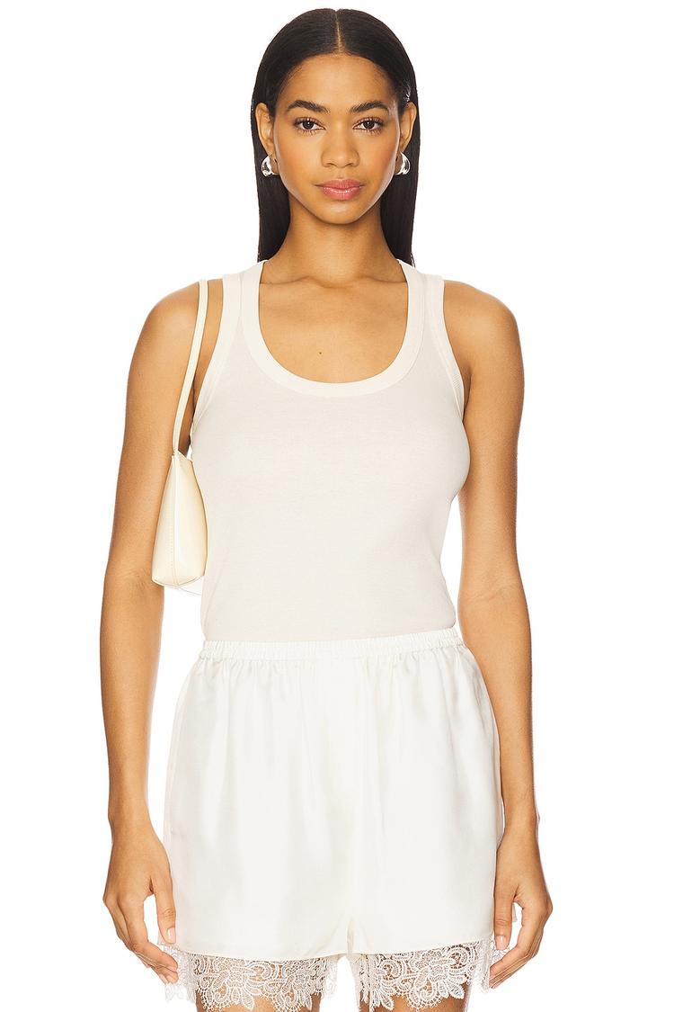 Soft rib knit cotton and a slim silhouette define this off-white tank top with a classic scoop neck and wide straps. Its sleeveless design and hip-length cut make it a versatile layering piece or standalone top, perfect for spring and summer days. The semi-sheer texture adds a subtle, delicate dimension, ideal for casual outings, everyday wear, or travel. Effortlessly chic, this top pairs well with a variety of looks, bringing minimalist elegance to your warm-weather wardrobe.