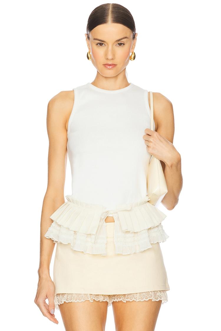 Soft white jersey fabric meets elegant layered ruffle trim in this fitted tank top, designed with a high neckline and sleeveless silhouette for warm-weather versatility. The pull-on style features a tie-up closure at the waist, accentuating your shape while adding a chic detail. Crafted from a cotton-polyester blend with crepe accents, this hip-length top pairs effortlessly with skirts or pants, making it ideal for casual days, brunch outings, or polished workwear looks in spring and summer.