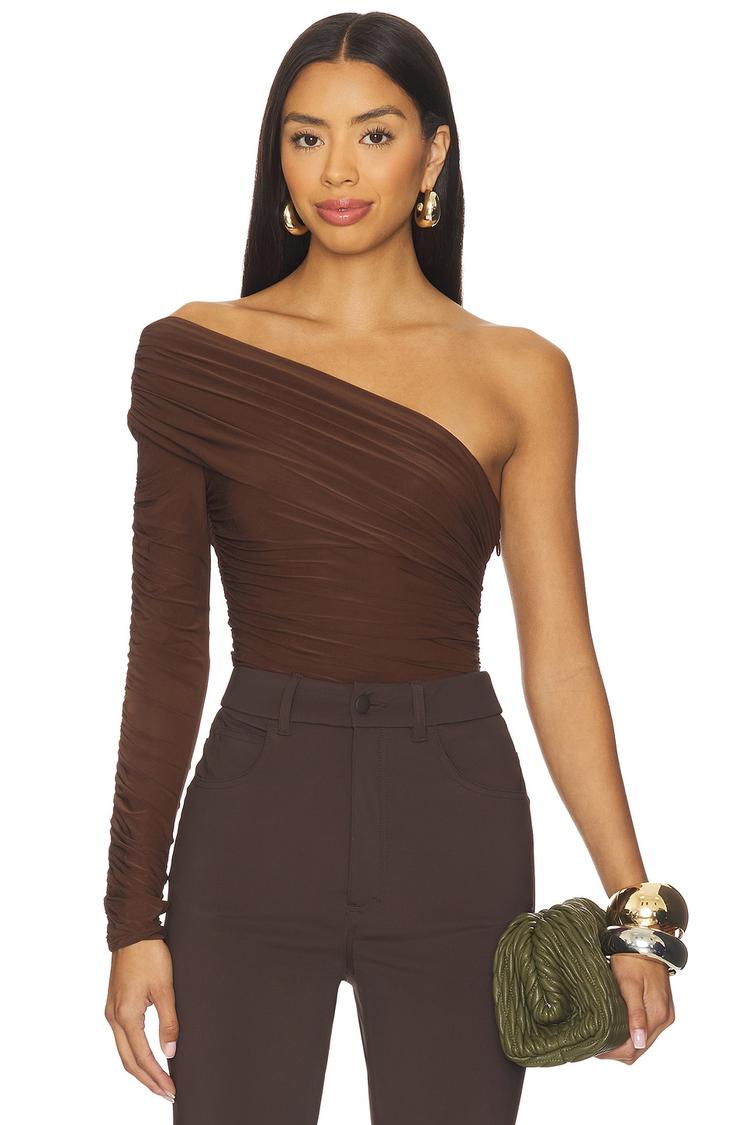 Sleek and form-fitting, this Adriene Top features a sophisticated one-shoulder asymmetric neckline and long sleeves crafted from slinky polyester-spandex blend fabric with elegant ruching all over. The matte brown hue enhances its modern, chic appeal, while the hidden side zipper ensures a smooth silhouette. Ideal for casual outings, date nights, or evening events, this waist-length cropped top offers a sexy yet refined look that effortlessly elevates your wardrobe.