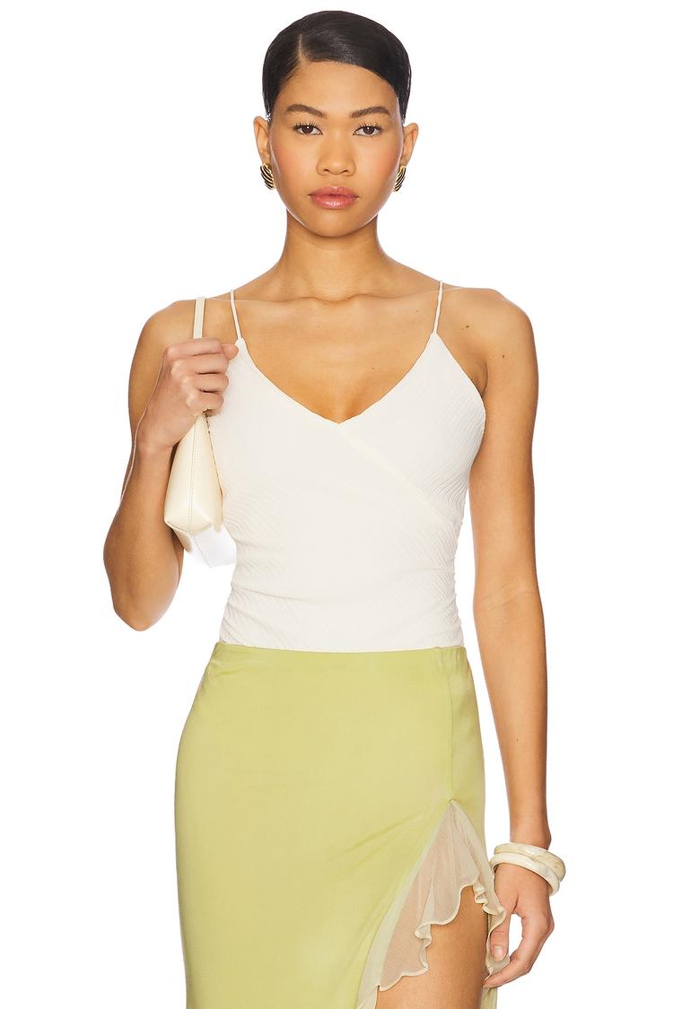 Softly structured with a midweight ribbed chiffon fabric, this fitted camisole features delicate spaghetti straps and a flattering V-neckline. The hidden side zipper and snap button gusset closure ensure a sleek silhouette, while its off-white hue adds a touch of minimalist chic. Perfectly suited for spring and summer, this waist-length top transitions effortlessly from casual brunches to stylish date nights, making it a versatile wardrobe staple.