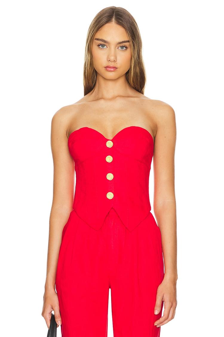 Bright red linen brings a fresh, elegant vibe to this fitted corset top, featuring a flattering sweetheart neckline and strapless design. Lightly padded cups ensure comfort while the hidden back zipper offers a sleek finish. The front button details add a sophisticated touch, making it a standout piece for spring and summer. Ideal for casual outings, brunch dates, or night outs, this waist-length top pairs beautifully with high-waisted bottoms for a chic, polished look.