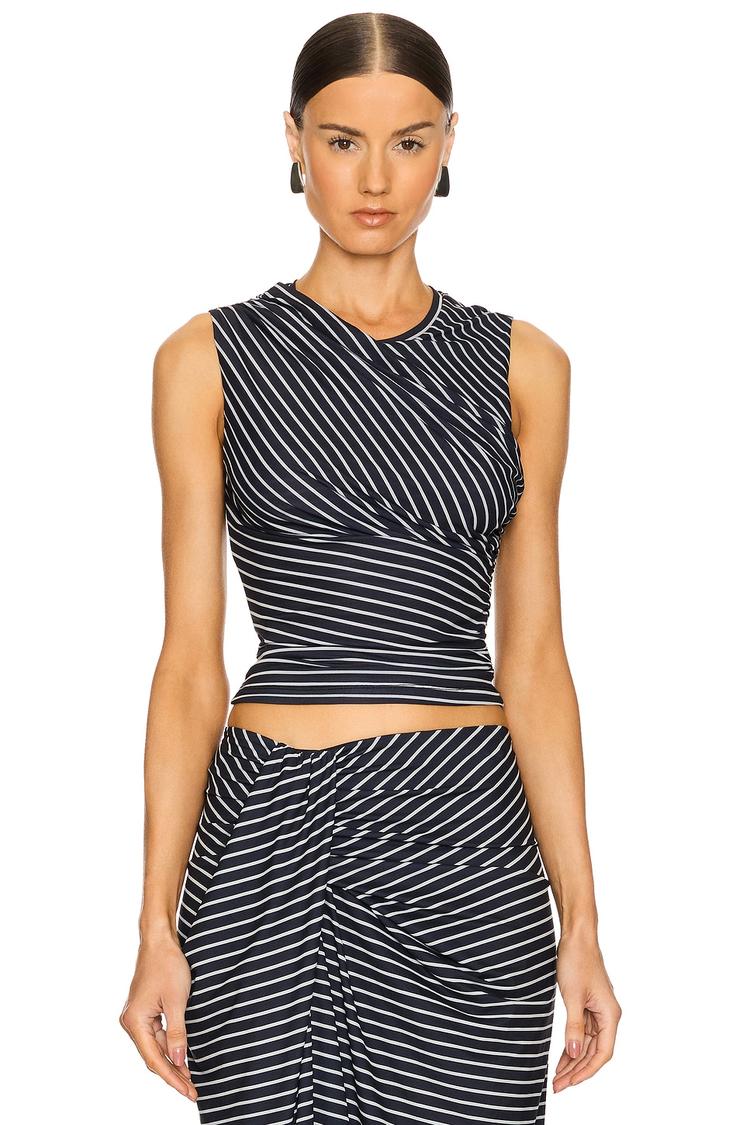 Ruched mesh fabric brings texture and modern edge to this fitted tank top featuring an all-over white striped pattern on matte black. With a round neckline, sleeveless styling, and waist length hem, it offers a flattering silhouette perfect for spring and summer days. This chic and trendy piece pairs effortlessly with skirts or pants for casual outings, brunch with friends, or a night out on the town. Crafted with polyester and spandex for stretch and comfort, it combines style and ease for versatile wear.