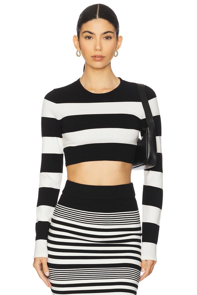 Bold black and white stripes define this slim-fit cropped knit top, crafted from a midweight viscose-polyester blend. Featuring a classic crew neck and long regular sleeves, it offers a sleek silhouette with full back coverage. The pullover style makes it easy to wear, while the all-over horizontal stripes add a striking modern edge. Ideal for autumn, winter, and spring, it fits perfectly for casual outings, brunch dates, and streetwear-inspired looks.