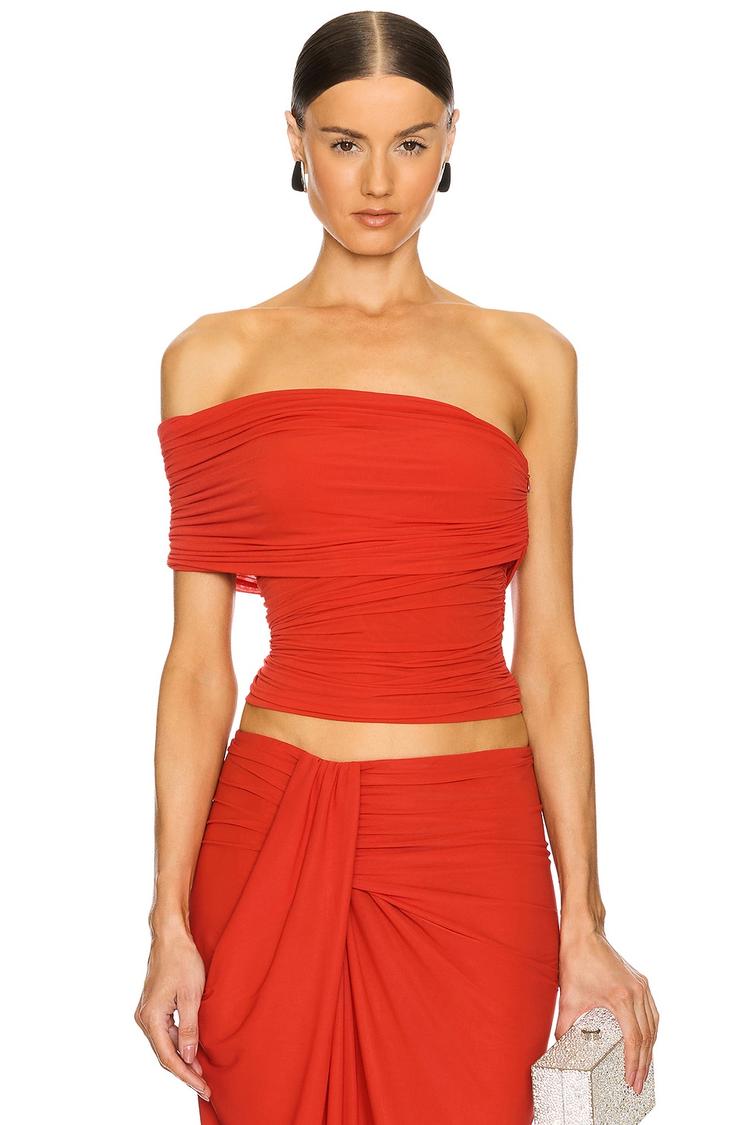 Bold and alluring, this cropped Ranada Top features a fitted silhouette crafted from a stretchy polyester-spandex jersey fabric. The one-shoulder, strapless design is accentuated by all-over ruching that adds texture and visual interest. A hidden zipper closure ensures a sleek back profile. Perfect for spring and summer evenings, this chic top elevates your look for cocktail parties, date nights, and nights out with friends, blending sexy style with modern sophistication.