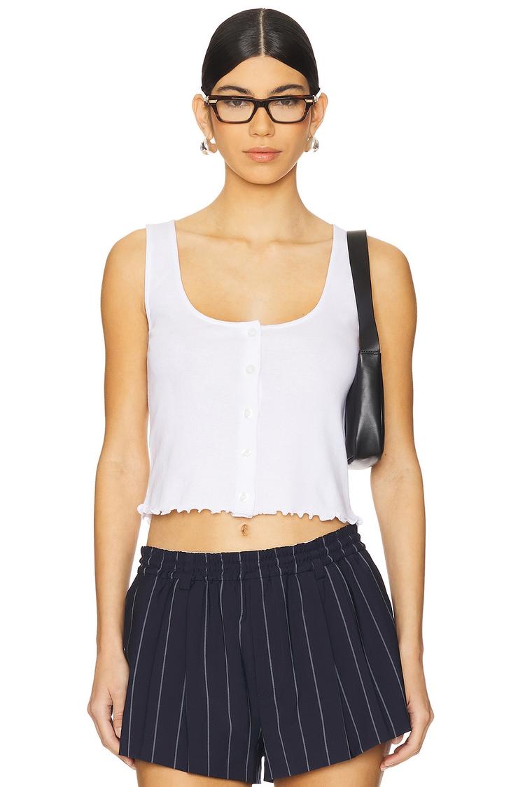 Soft organic cotton jersey meets a fresh cropped silhouette in this sleeveless top featuring wide straps and a flattering square neckline. The front button closure adds a casual charm, while the delicate brand embroidery at the back and playful lettuce edge hem bring subtle, refined details. Ideal for spring and summer days, its regular fit and breathable fabric make it perfect for casual outings, everyday wear, or relaxed brunches with friends. A minimalist staple that combines comfort with effortless style.