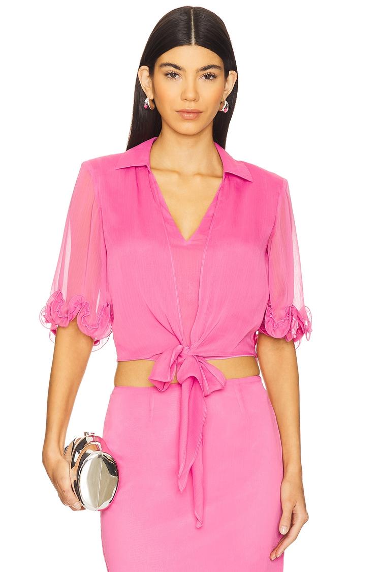 Bright pink chiffon meets modern design in this cropped top featuring a flattering V-neck and puffed elbow-length sleeves with ruffled cuffs. The front self-tie detail and concealed side zipper combine style and functionality, while detachable shoulder pads add structure. Perfect for casual outings, brunches, or night outs, its regular fit and midweight fabric ensure comfortable wear across spring, summer, and autumn seasons.