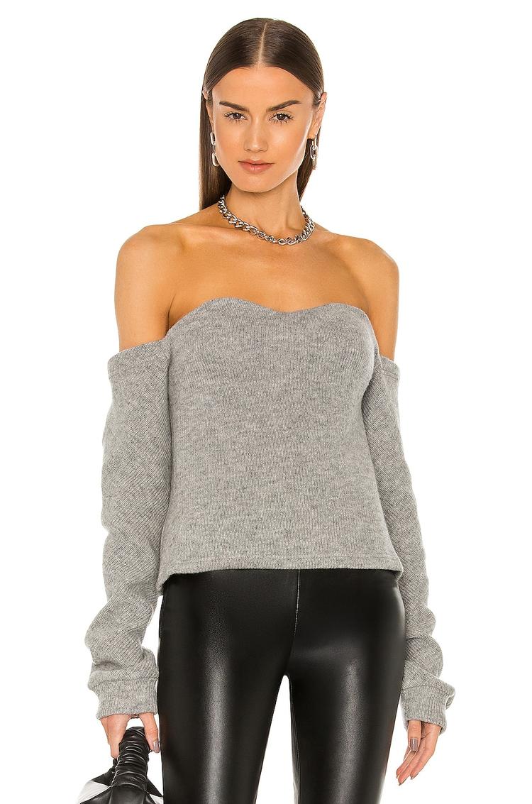 Soft knit fabric and a fitted silhouette define this bandeau top with a flattering sweetheart neckline and long, exaggerated off-shoulder sleeves. The hip-length hem and open back with hook and eye closure add subtle allure, making it a versatile choice for casual outings, date nights, and evenings out. Crafted from a comfortable cotton blend, this modern and chic top pairs perfectly with leather pants or skirts for an elevated, sexy look across autumn, winter, and spring seasons.