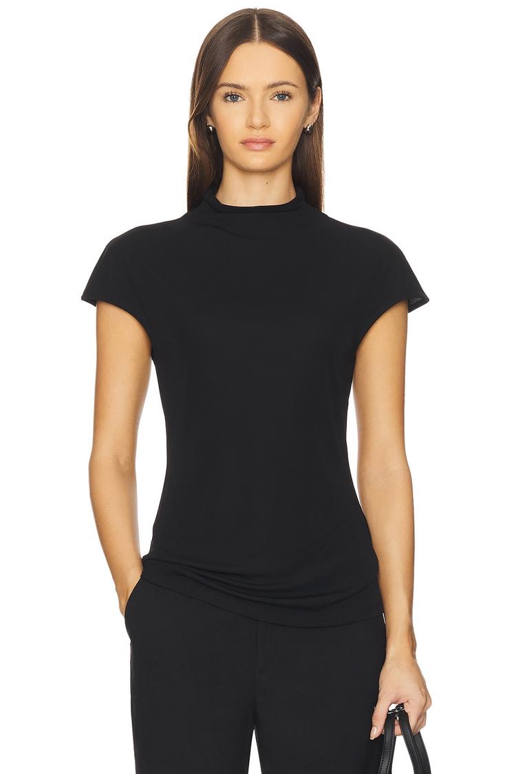 A sleek matte black shell top crafted from a breathable crepe fabric blend of viscose and spandex offers a fitted silhouette and a modern mock neck. The sleeveless style features capped sleeves for subtle coverage, hitting at hip length for versatile layering. This minimalist and classic piece is perfect for casual days, workwear, and business casual occasions, providing comfort and elegance throughout all seasons. Its pullover design makes it easy to wear, making it a reliable wardrobe staple for everyday sophistication.