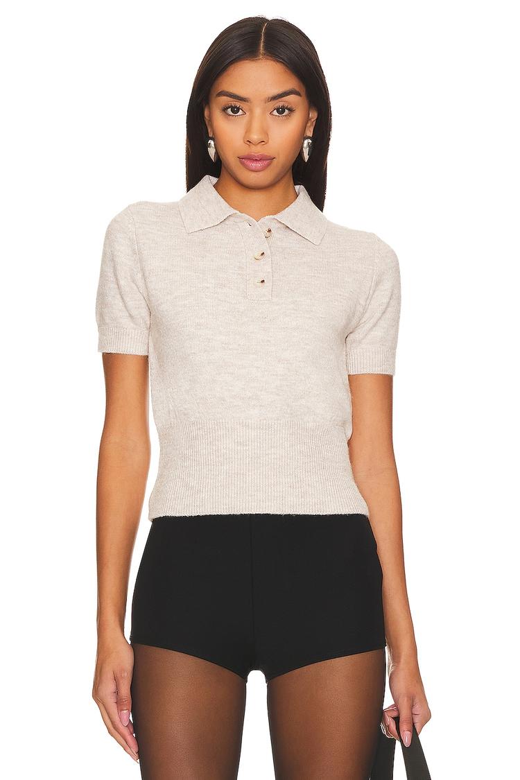 A refined knit polo top in a soft matte beige shade, designed with a classic button collar and half sleeves for timeless appeal. This fitted waist-length piece blends comfort with sophistication through its premium polyester blend fabric, perfect for all-weather wear. Its minimalist style suits versatile occasions from casual outings and workwear to business casual settings. The clean silhouette and covered back deliver an elegant yet understated look, making it an essential addition to any wardrobe that values both style and comfort.