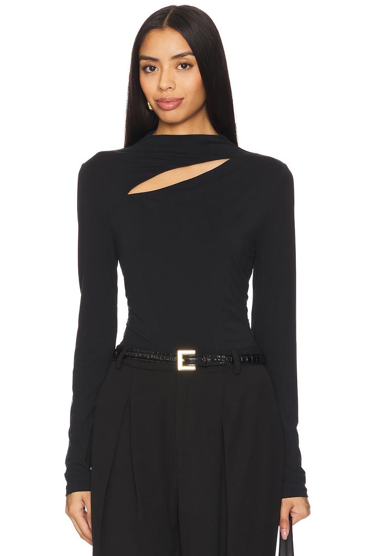 Sleek and sophisticated, this fitted black shell top features a distinctive chest cut-out that adds a modern edge to its minimalist silhouette. Crafted from a heavyweight slinky jersey blend of modal, rayon, and spandex, it offers comfortable stretch and a smooth finish. The long sleeves and crew neckline maintain classic appeal, while the hip-length hem provides versatile styling options. Ideal for casual days, business casual settings, and stylish brunches or date nights, this top combines subtle detail with everyday practicality for a contemporary wardrobe staple.