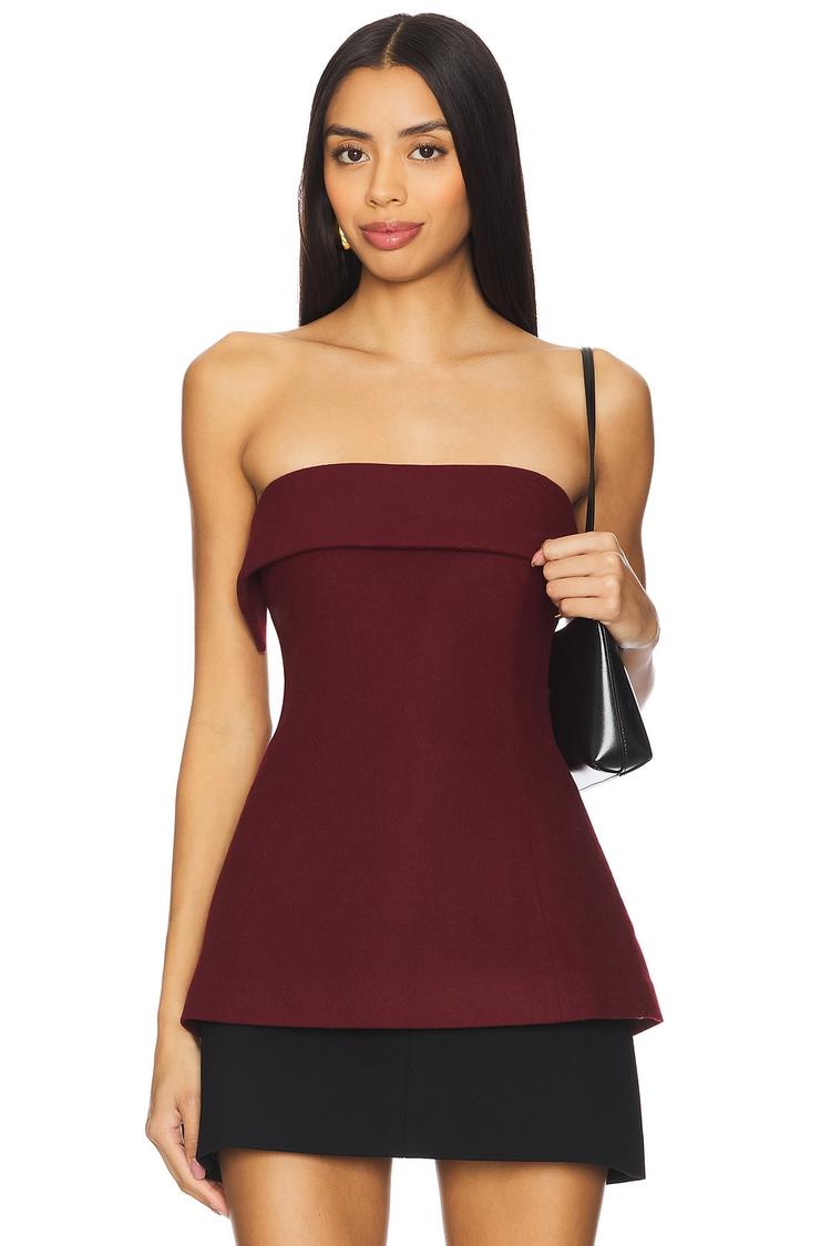 Structured in a midweight ponte fabric blend of wool and viscose, this fitted peplum top features a straight, strapless neckline and a concealed back zipper for a sleek finish. The matte burgundy hue and hip-length silhouette create a sophisticated and elegant look perfect for autumn and winter seasons. Ideal for business casual settings, date nights, or a night out, this top offers timeless style with a contemporary edge.