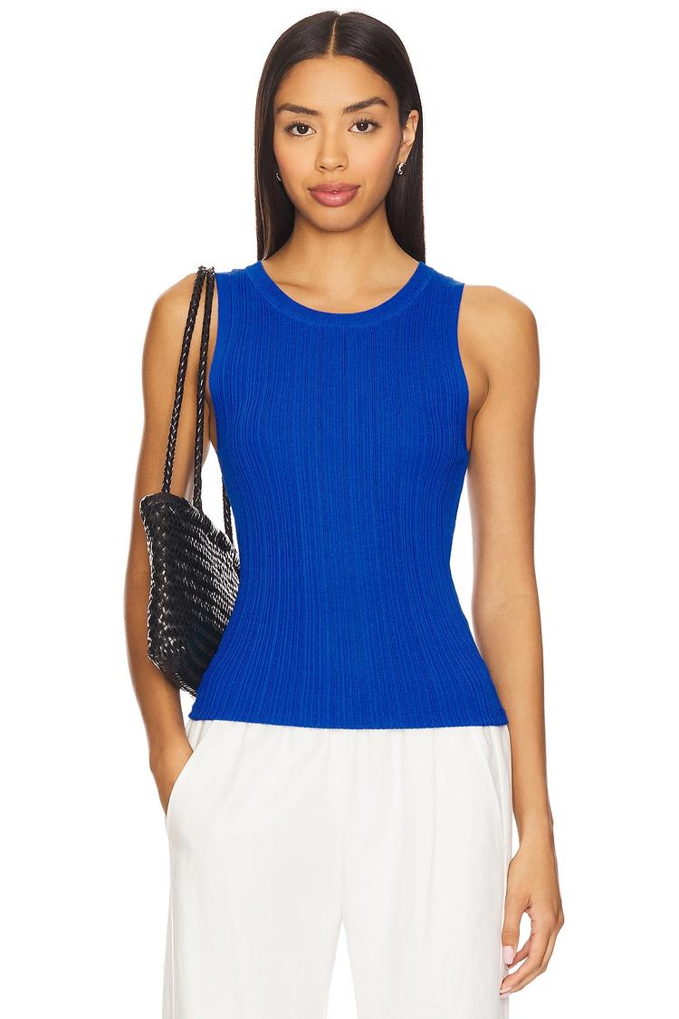 Bright blue rib knit fabric shapes this fitted tank top, featuring wide straps and a classic round neckline. Its hip-length silhouette offers a sleek, minimalist profile perfect for warm weather. Crafted from a soft viscose and nylon blend, this midweight knit combines comfort and stretch for everyday ease. Ideal for casual outings, brunch dates, or travel, it pairs effortlessly with light trousers or skirts to create a chic, understated look.
