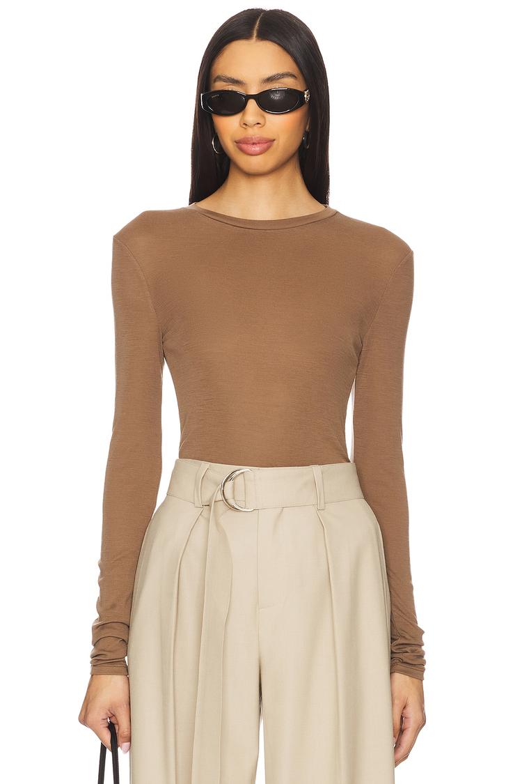 Rich matte brown wool fabric and a fitted silhouette define this classic shell top, featuring a timeless crew neck and long regular sleeves. Its hip length and pullover style make it a versatile layering essential, ideal for autumn and winter seasons. Whether at the office, business meetings, or casual outings, this minimalist and sophisticated top blends comfort and elegance effortlessly.