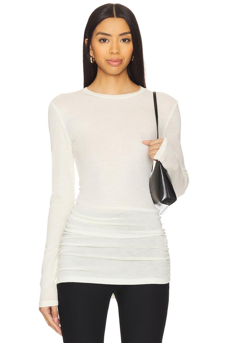 Soft off-white wool knit in a lightweight jersey fabric defines this longline top with a slim fit and classic crew neckline. The full-length sleeves and covered back provide cozy coverage, while side ruching adds subtle texture and visual interest to the hip-length hem. Its semi-sheer construction lends a delicate, modern edge making it perfect for layering. Ideal for casual days, professional workwear, or business casual settings, this minimalist and elegant piece blends comfort with refined style across autumn, winter, and spring seasons.