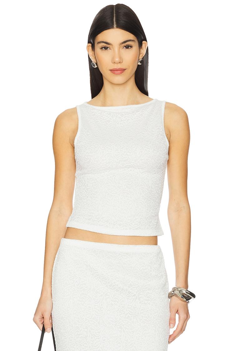 Midweight textured lace fabric forms this fitted tank top with a classic round neckline and sleeveless design, offering a clean, minimalist silhouette. Its waist-length cut and covered back make it an essential piece for casual outings, brunches, and everyday wear. Crafted from a stretchy nylon-elastane blend, it ensures comfortable wear and easy slip-on closure. The pristine matte white hue lends versatility, making it perfect for layering or standalone wear in all seasons.
