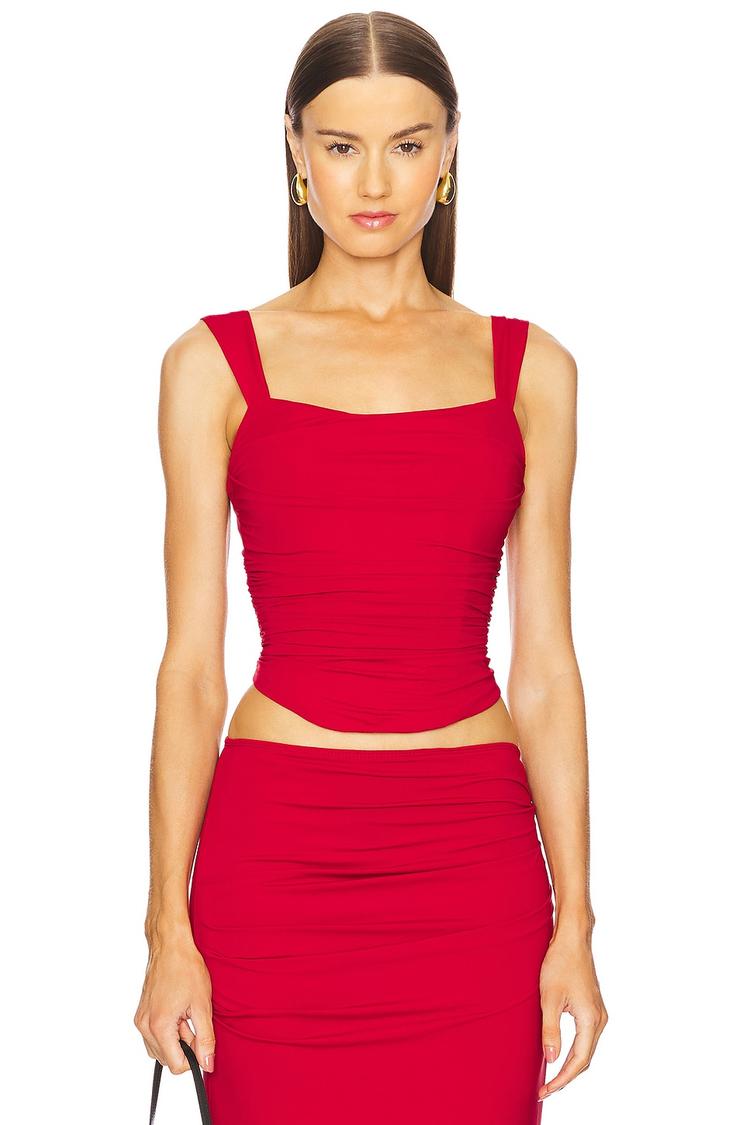 Bold in vibrant red, this fitted cropped corset top features a square neckline and wide straps for a flattering silhouette. Crafted from a lightweight nylon and elastane jersey fabric, it ensures comfortable stretch and shape retention. The exposed back zipper closure adds an edgy detail, making it perfect for casual outings, night outs, or date nights in warmer seasons. Its sleek bonded bodice and sleeveless design emphasize a modern and trendy aesthetic that pairs effortlessly with high-waisted skirts or pants.