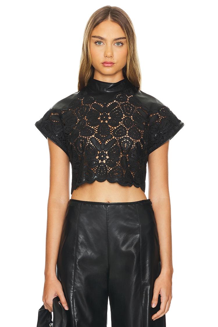 Matte black faux leather paired with a delicate floral lace front panel creates a striking cropped top with a fitted silhouette. Featuring a high neck and cap sleeves, this chic piece closes with a partial side zipper at the covered back for a sleek finish. The lace trim detail adds a touch of modern sophistication to the sleeveless design. Perfect for casual daytime outings, brunch with friends, or a night out, this versatile top combines edgy texture with feminine accents for a confident style statement.