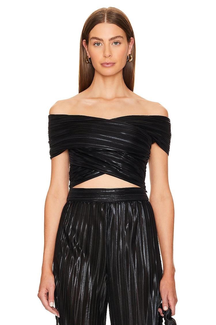 Shimmering metallic black lamé fabric and a fitted, cropped silhouette define this elegant Reyna top. Featuring an off-shoulder neckline with wide straps and sleeveless styling, its all-over ruching adds texture and a refined modern edge. Lightweight and perfect for night outs, cocktail events, or date nights, this slip-on piece brings a chic and sexy vibe to your evening wardrobe.