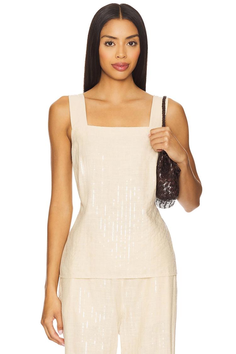 Shimmering sequin embellishments elevate this fitted tank crafted from a rayon-linen blend, perfect for warm weather. Featuring a flattering square neckline front and back, wide straps, and a hip-length silhouette, it pairs beautifully with casual or chic occasions like brunch and date nights. The front button closure and tie-up accent at the waist enhance the elegant yet minimalist design, making it a versatile piece for spring and summer wardrobes.
