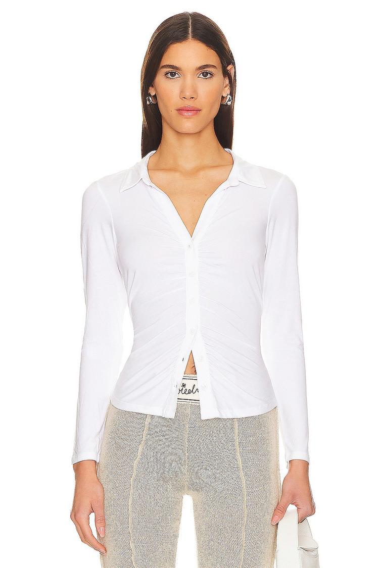 Soft jersey fabric and a fitted silhouette define this classic henley shirt, featuring long sleeves and a flattering V-neckline. The front button closure is complemented by subtle ruching along the front, adding a chic texture to the otherwise minimalist design. Its hip length and covered back make it versatile for layering or wearing alone. Ideal for casual days, workwear, business casual settings, or brunch dates, this white top combines comfort and style effortlessly.