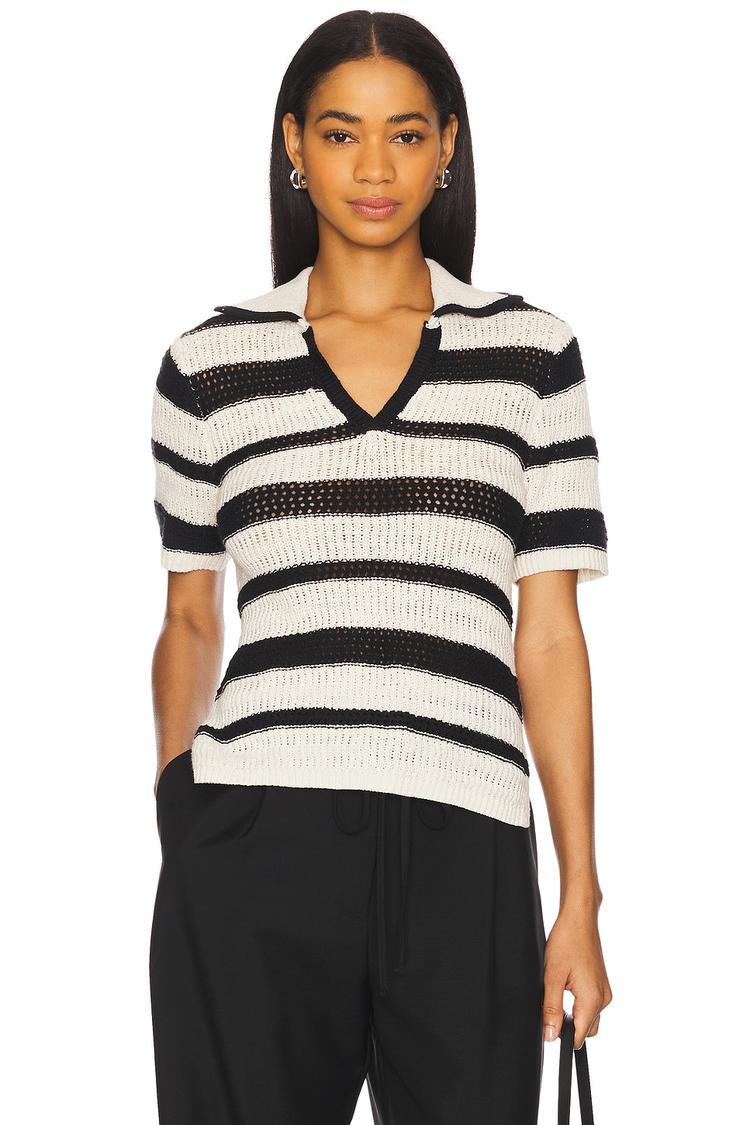 Soft cotton knit and a classic striped pattern define this collared shell top with half sleeves and a flattering V-neckline. The regular fit and hip-length hem create an effortlessly chic silhouette, enhanced by ribbed trim details. Its semi-sheer, midweight open knit fabric offers breathable comfort, perfect for spring, summer, and autumn days. Ideal for casual outings, workwear, and business casual settings, this versatile top blends minimalist style with timeless appeal.