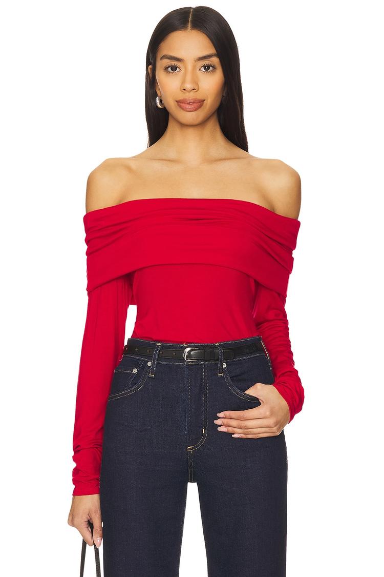 Radiate bold elegance with this fitted off-shoulder top in vibrant red. Crafted from a soft blend of rayon and elastane, it features a draped fold-over neckline that beautifully accentuates the shoulders. Its long sleeves and hip-length silhouette make it a versatile piece ideal for casual outings, brunch dates, or romantic evenings. The smooth fabric and chic design combine for a modern yet timeless look that's both comfortable and stylish across seasons.