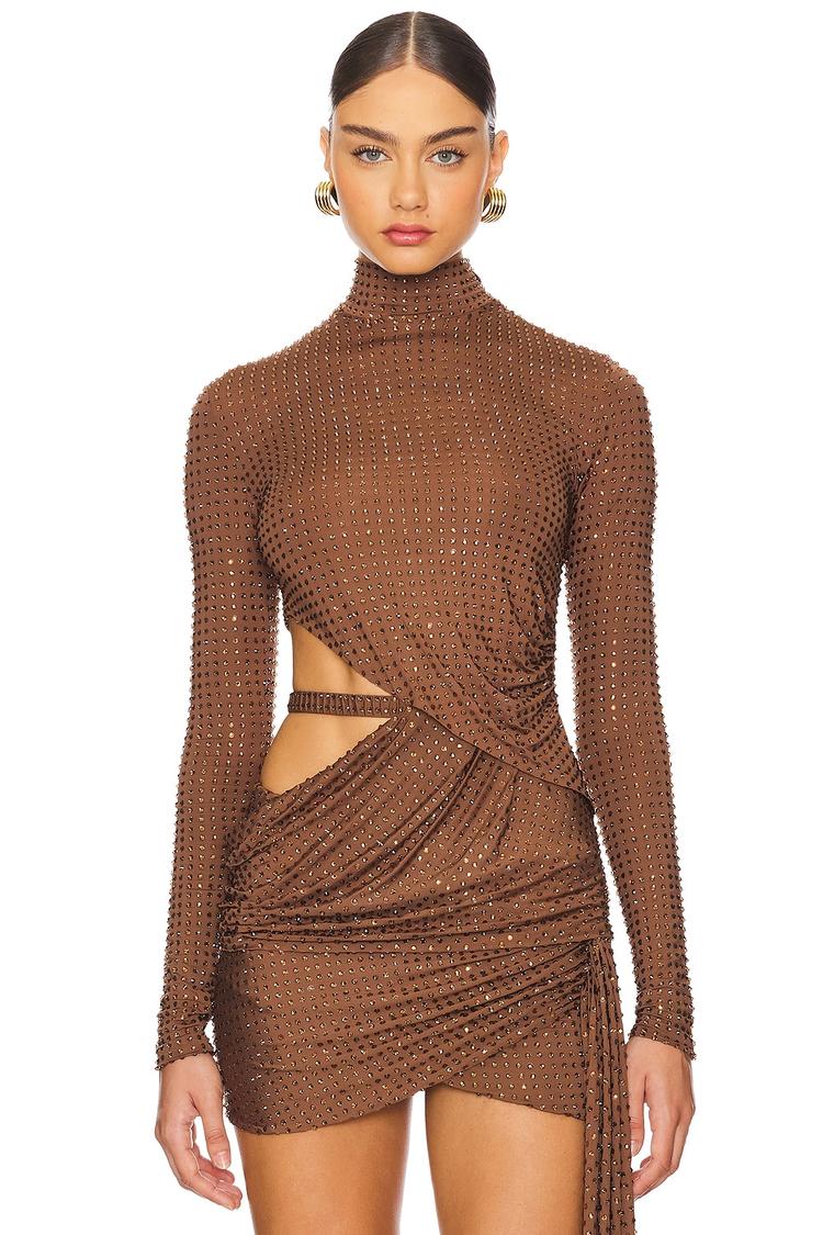 A sultry silhouette enhanced by a high neck and long sleeves, this longline top captivates with its thigh-length hem and elegant cut-outs at the sides. Crafted from a midweight polyester-elastane blend, it features stone embellishments that glisten subtly all over, combined with ruched detailing and an attached elastic waist belt for a flattering slim fit. Perfectly suited for night outs, cocktail parties, and date nights, this modern and trendy piece offers a bold yet sophisticated statement in rich matte brown tones.