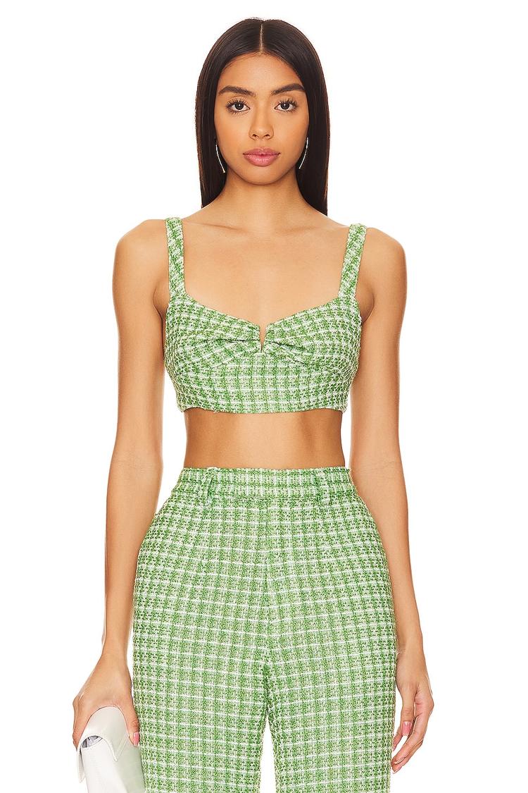 This modern cropped top in a fitted silhouette features a straight neckline and wide straps, crafted from a tweed polyester-spandex blend for comfortable stretch. The classic checkered pattern in light green and white adds a fresh spring-summer vibe. With a back covered design and hook-and-eye closure, it offers adjustable shoulder straps for a perfect fit. Ideal for casual outings, brunch dates, or relaxed evenings, this Avery Top brings chic versatility to your warm-weather wardrobe.