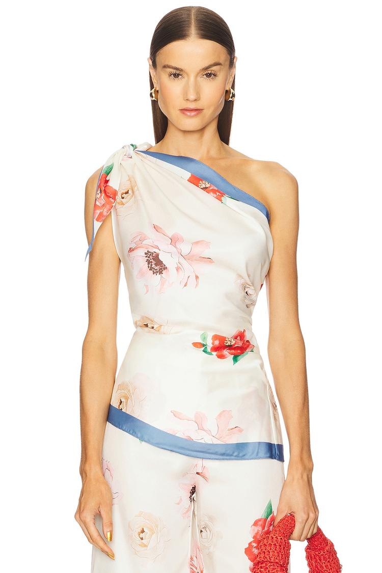 Soft drape and an asymmetric neckline come together in this elegant camisole crafted from lightweight floral satin polyester. Featuring a ruched side and a tie shoulder strap, this slim-fit hip-length top blends romantic charm with chic details. Its semi-sheer fabric and all-over floral print accented by blue borders make it perfect for spring and summer occasions like brunch, casual outings, or date nights.