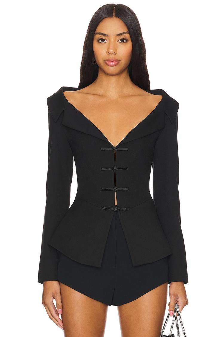 Sharp tailoring and a sleek matte black finish define this elegant Peplum top. Crafted from a polyester-rayon blend with a satin backing, it features a fitted silhouette with a plunging neckline and long regular sleeves. The front button closure adds classic sophistication, while the peplum hem enhances your shape with a refined flair. Ideal for business casual settings, workwear, or cocktail events, this hip-length top blends timeless style with versatile wearability for all seasons.
