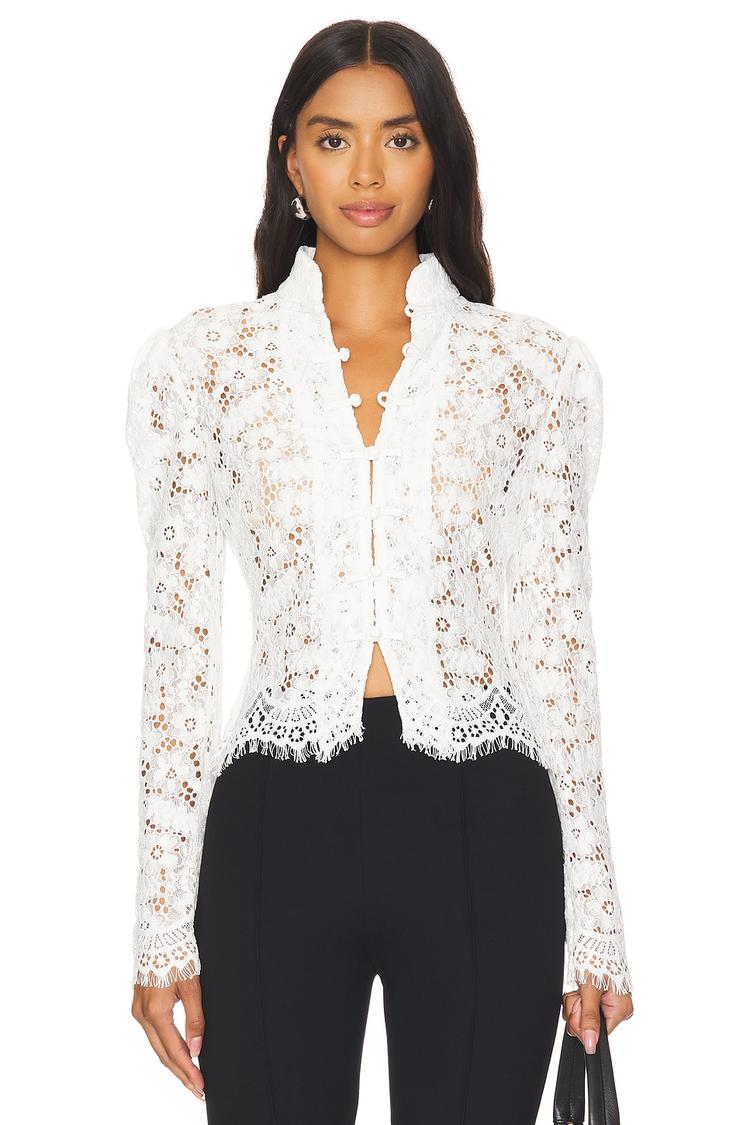 Delicate applique work adorns this fitted shell top in a crisp white hue, featuring a chic mandarin collar and long regular sleeves. The lightweight, sheer fabric offers a sophisticated yet breathable wear, finished with an elegant front frog knot tie closure. Its hip-length cut and covered back make it ideal for workwear, business casual settings, and stylish brunch outings. This versatile piece combines classic elegance with modern detailing, perfect for all-season wear when you want to elevate your look with subtle texture and refined style.