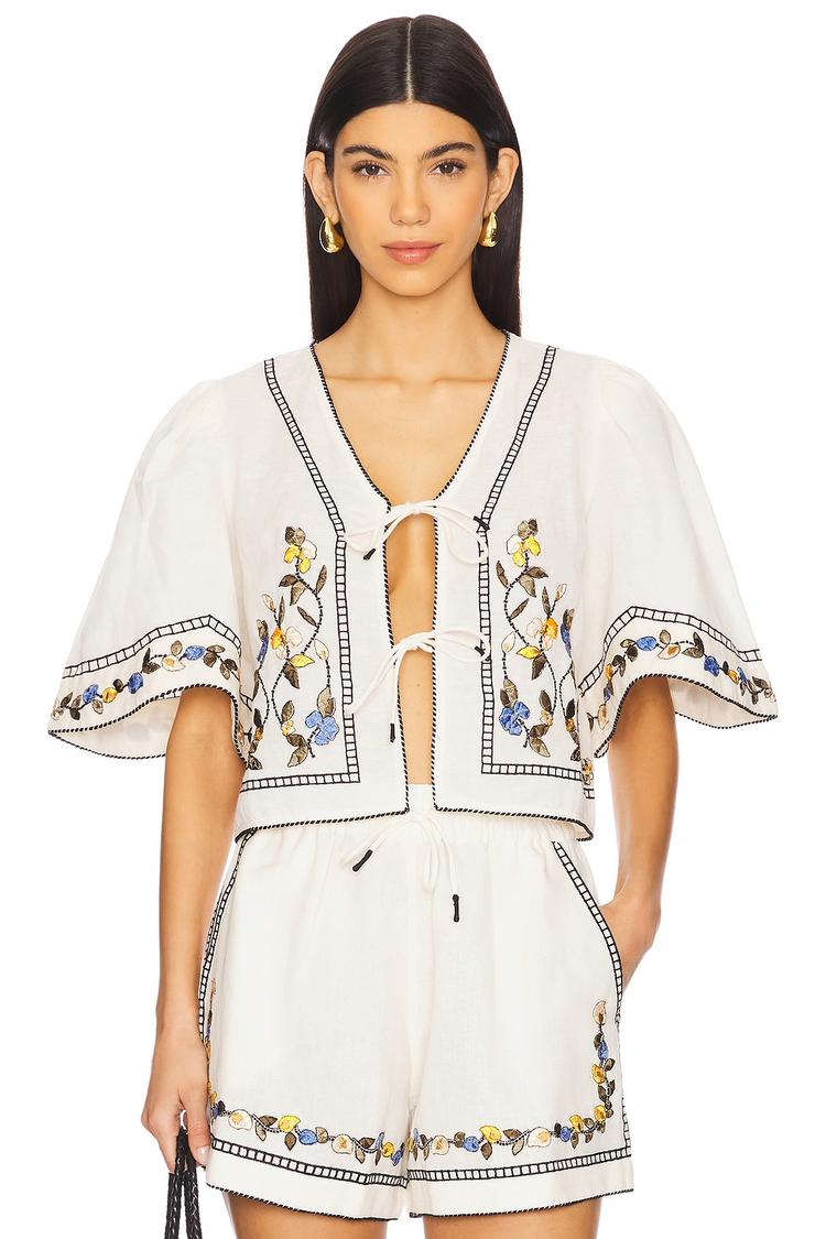 Soft linen and cotton blend fabric defines this relaxed boxy top featuring a flattering V-neck and flared half sleeves with embroidered floral trims. Dual front tie closures add a charming bohemian touch, complemented by subtly padded shoulders for structure. The waist-length silhouette and contrast embroidery detail make it an ideal choice for casual outings, brunches, and vacation days. Lightweight yet midweight in feel, this top blends romantic style with everyday comfort effortlessly.