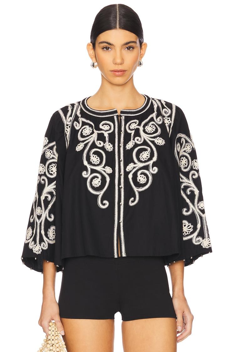 Intricate silver embroidery and bead detailing adorn this loose-fitting blouson top crafted from midweight cotton poplin. Featuring a round neckline and three-quarter regular sleeves, the hip-length silhouette offers both comfort and style. The front silver-toned loop button closures add a refined touch to this black top, making it a perfect pick for casual outings, brunches, or workwear. Its bohemian chic vibe combined with elegant details makes it versatile for all-weather wear and elevates everyday dressing with a subtle yet striking statement.