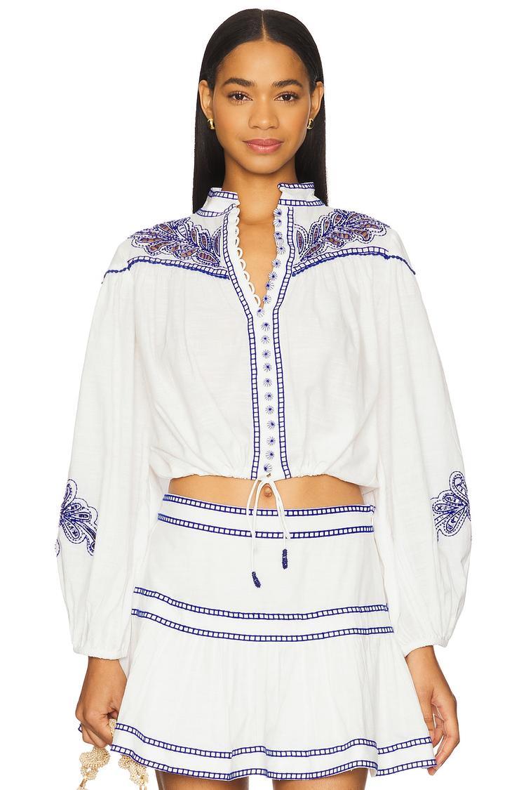 blue and white embroidered top