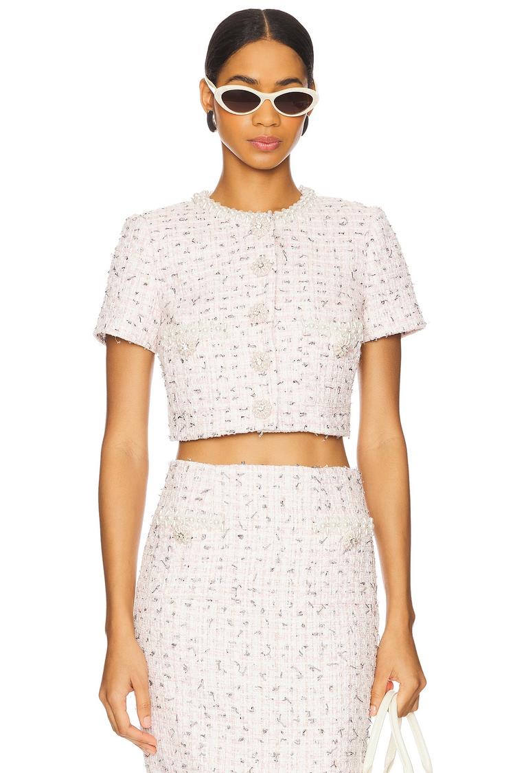 Soft boucle fabric and pearl embellishments bring a timeless elegance to this cropped top. Featuring a fitted silhouette, half sleeves, and a classic round neckline, this piece is detailed with a pearl-embellished collar and front pockets for subtle luxury. The front button closure adds a polished finish, making it perfect for workwear, brunches, or business casual occasions during spring and autumn. Crafted from a cotton-polyester blend, it offers both comfort and structure in a refined off-white hue.