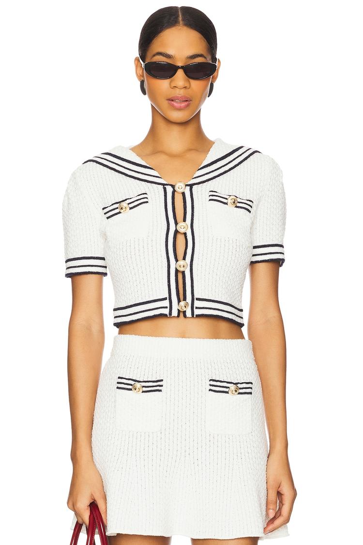 Textured knit fabric and a fitted cropped silhouette define this classic top featuring a chic V-neck and half sleeves. Navy stripe details accent the collar, sleeve cuffs, and front pockets, complemented by a neat front button closure. Ideal for spring, summer, and autumn wear, this versatile piece suits casual outings, brunches, workwear, business casual settings, and date nights with its minimalist and refined style.