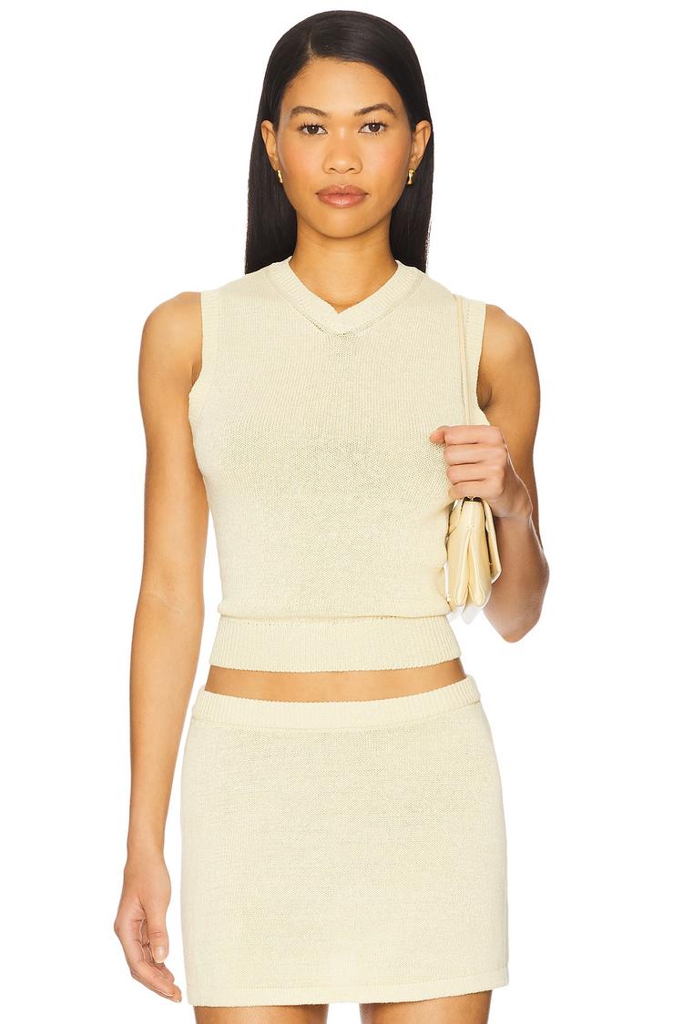Soft ribbed trim and a lightweight knit fabric define this fitted tank top in a matte beige hue. Featuring a classic V-neck and sleeveless wide straps, this waist-length vest top delivers minimalist style with a comfortable blend of linen, cotton, nylon, and elastane. Ideal for spring and summer, its versatile silhouette suits casual outings, brunch dates, and everyday wear with ease.