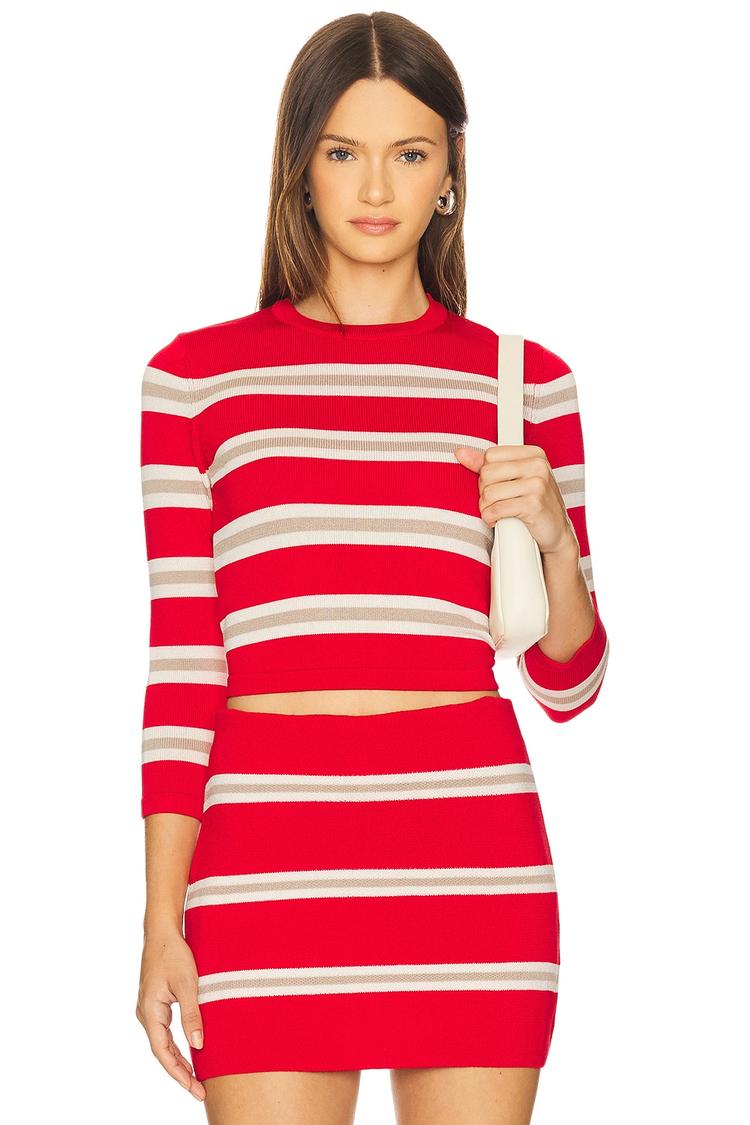 Bright red and off-white stripes create a vibrant, modern look in this fitted cropped knit top. Crafted from a midweight polyester-viscose blend, it features a classic crew neck and three-quarter regular sleeves, offering casual chic versatility. The pullover style with covered back ensures easy wear, while the cropped length pairs perfectly with high-waisted bottoms. Ideal for casual outings, brunch dates, or everyday streetwear, this striped top blends contemporary style with comfortable fit and breathable fabric.