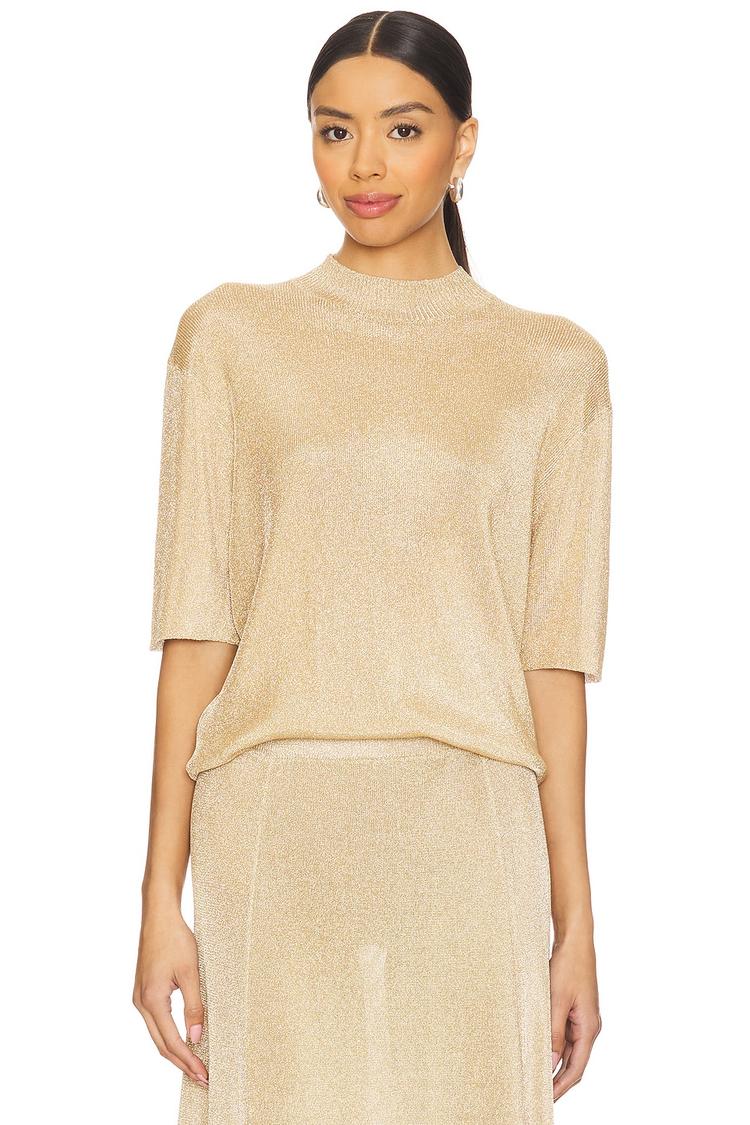 Sleek shimmer beige knit fabric with metallic threading defines this relaxed-fit shell top. Featuring a high neck and elbow-length regular sleeves, its hip-length silhouette offers a polished yet comfortable look. The slip-on design and smooth viscose-lurex blend provide effortless wearability, making it a versatile choice for casual outings, workwear settings, or a stylish night out. Its minimalist elegance and subtle metallic sheen add a chic touch to any ensemble.