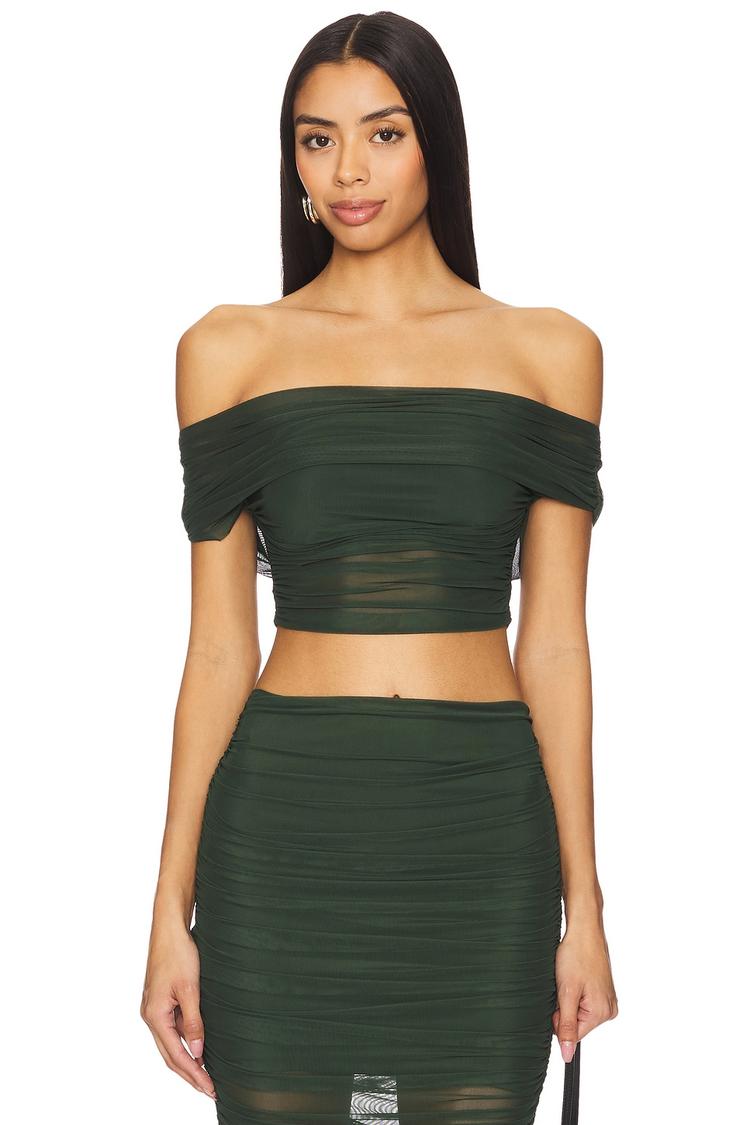 Off-shoulder allure meets modern design in this fitted cropped top crafted from lightweight mesh fabric. Featuring a foldover ruched neckline and all-over ruching, its straight neck and sleeveless styling create a sleek silhouette perfect for spring and summer. Ideal for casual outings, brunches, or night outs, this matte dark green top offers both comfort and a chic, sexy vibe. Easy to wear with its pullover closure, it pairs effortlessly with skirts or high-waisted pants for versatile styling options.