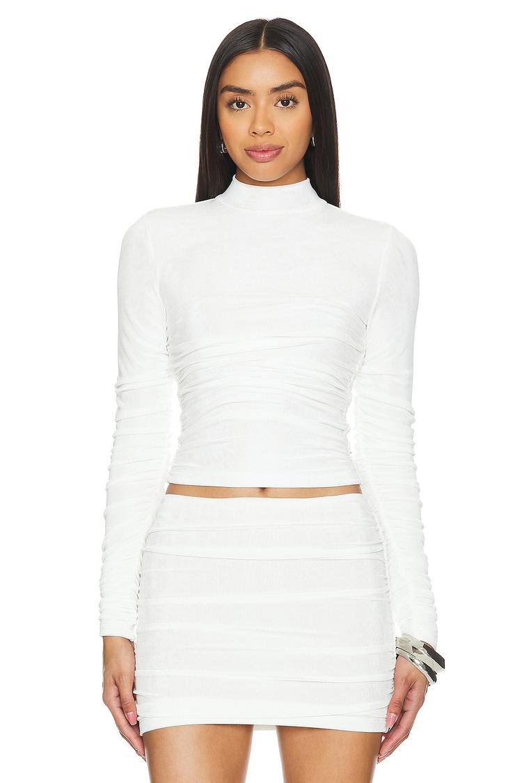 Sculpted in a fitted silhouette with elegant ruching detail throughout, this white high neck top offers a modern, chic appeal. Crafted from a stretch polyester-spandex blend, it ensures comfort and shape retention. The long sleeves and waist-length hem create a flattering, sleek profile perfect for layering or standalone wear. Ideal for casual outings, date nights, or nights out, this versatile piece combines style and sophistication effortlessly.