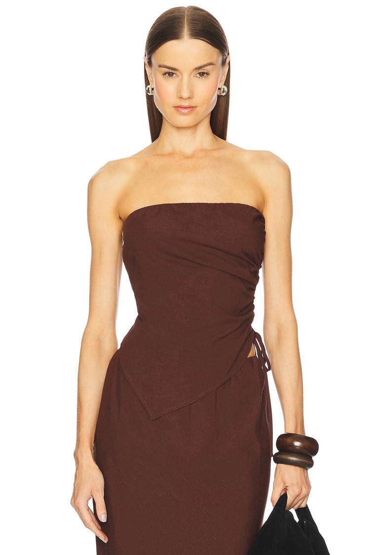 A sleek bandeau top crafted from a midweight blend of linen, viscose, polyester, and lined with cotton offers a fitted silhouette perfect for warmer seasons. Its straight neckline and strapless design highlight the shoulders elegantly, while the side ruching adds a flattering texture detail. An asymmetrical hemline enhances its modern appeal. Ideal for casual days, brunch outings, and date nights, this minimalist chic piece pairs effortlessly with various bottoms to elevate your seasonal wardrobe.